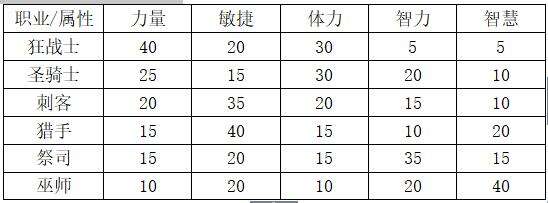 本题目要求力量、敏捷、体力、智力和智慧要求是随机值(利用随机数函数来取得随机数),但是五项属性的总和应该是100,并且应该和职业相关。例如狂战士的体力和力量就要比较高,而巫师需要较高的智力,而祭司则需要较高的智慧。各职业初始属性的大致比例应遵从下表: