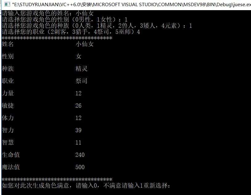 cout<<"如您对此次生成角色满意,请输入0,不满意请输入1重新选择:";