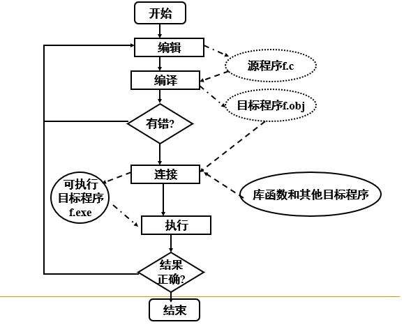 - 编辑:选择适当的编辑程序,将C语言源程序通过键盘输入到计算机中,并以文件的形式存入到磁盘中(.c)