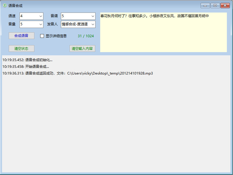 synthesisEvent("语音合成返回成功,文件:" + destPath);