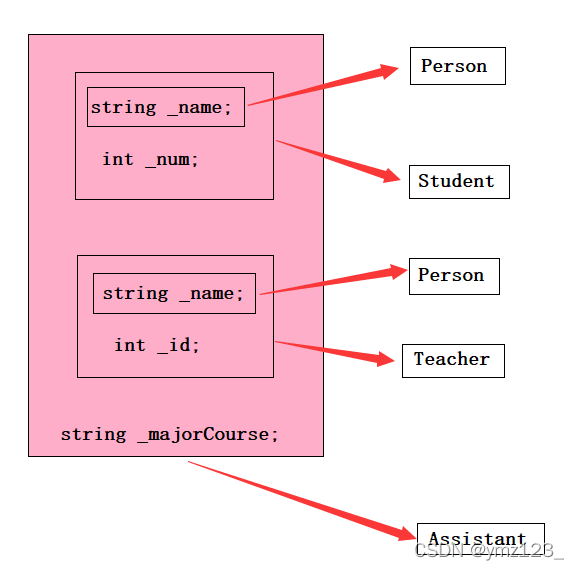 菱形继承的问题:从下面的对象成员模型构造,可以看出菱形继承有数据冗余和二义性的问题。在Assistant的对象中Person成员会有两份。