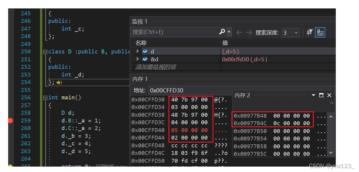 为了研究虚拟继承原理,给出一个简化的菱形继承体系,再借助内存窗口观察对象成员的模型。