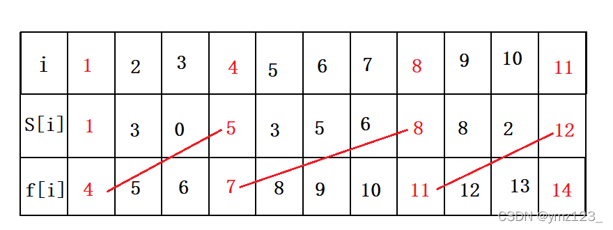 3.每次选取结束时间最早的活动(结束时间最早意味着开始时间也早),可以得到最优解。按这种方法选择,可以为未安排的活动留下尽可能多的时间。如下图的活动集合S,其中各项活动按照结束时间单调递增排序。