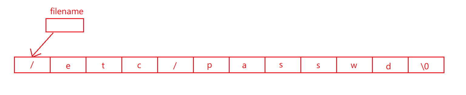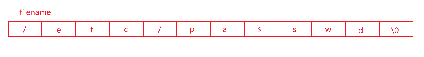 在定义时,filename是一个字符数组的名称。尽管在一个语句中引用filename的值将得到指向该数组起始元素的指针,但是filename的类型是”字符数组“,而不是字符指针。在第二个声明中,filename被确定为一个指针。这两种方式使用存储空间的方式是不同的,它们无法以一种合乎情理的方式共存。第一个例子字符数组filename的内存布局如下图所示: