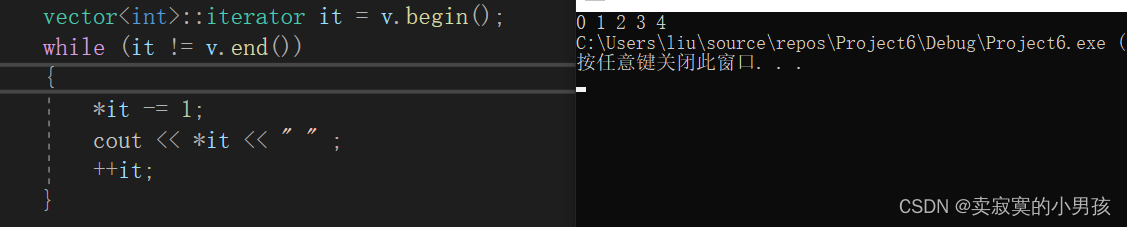 vector<int>::iterator it = v.begin();while (it != v.end()){*it -= 1;cout << *it << " " ;++it;}