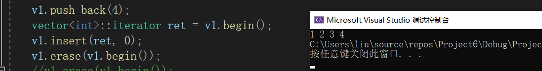这是因为我们对v1进行了插入数据,空间被重新分配了,原有的ret失效了。如果要删除首元素,需要使用v1.begin()来删除。