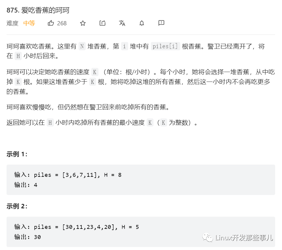if(0 != piles[i] % speed) hour += 1;香蕉的堆数以及每堆的数量是确定的,要在 H 小时内吃完,时间是输入参数,也是确定的了,现在唯一不确定的就是吃香蕉的速度,我们需要做的就是在最小速度 到 最大速度之间找出一个速度,使得刚好能在 H 小时内吃完香蕉 。