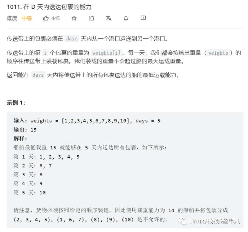 - 船的最小载重需要大于等于传送带上最重包裹的重量,因为每次至少要装载一个包裹