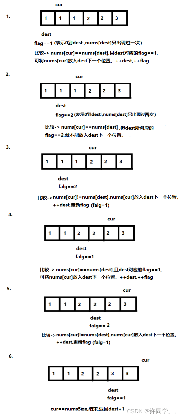 ⭐nums[cur]==nums[dest],如果dest所对应的flag为1,可将nums[cur]放入dest下一个位置,++dest, ++flag。如果dest所对应的flag为2,只移动cur.。
