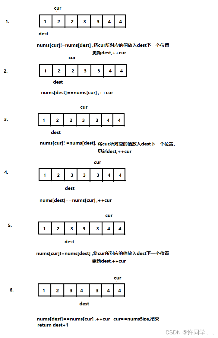 ⭐nums[cur]!=nums[dest],将nums[cur]放入dest下一个位置,更新dest。