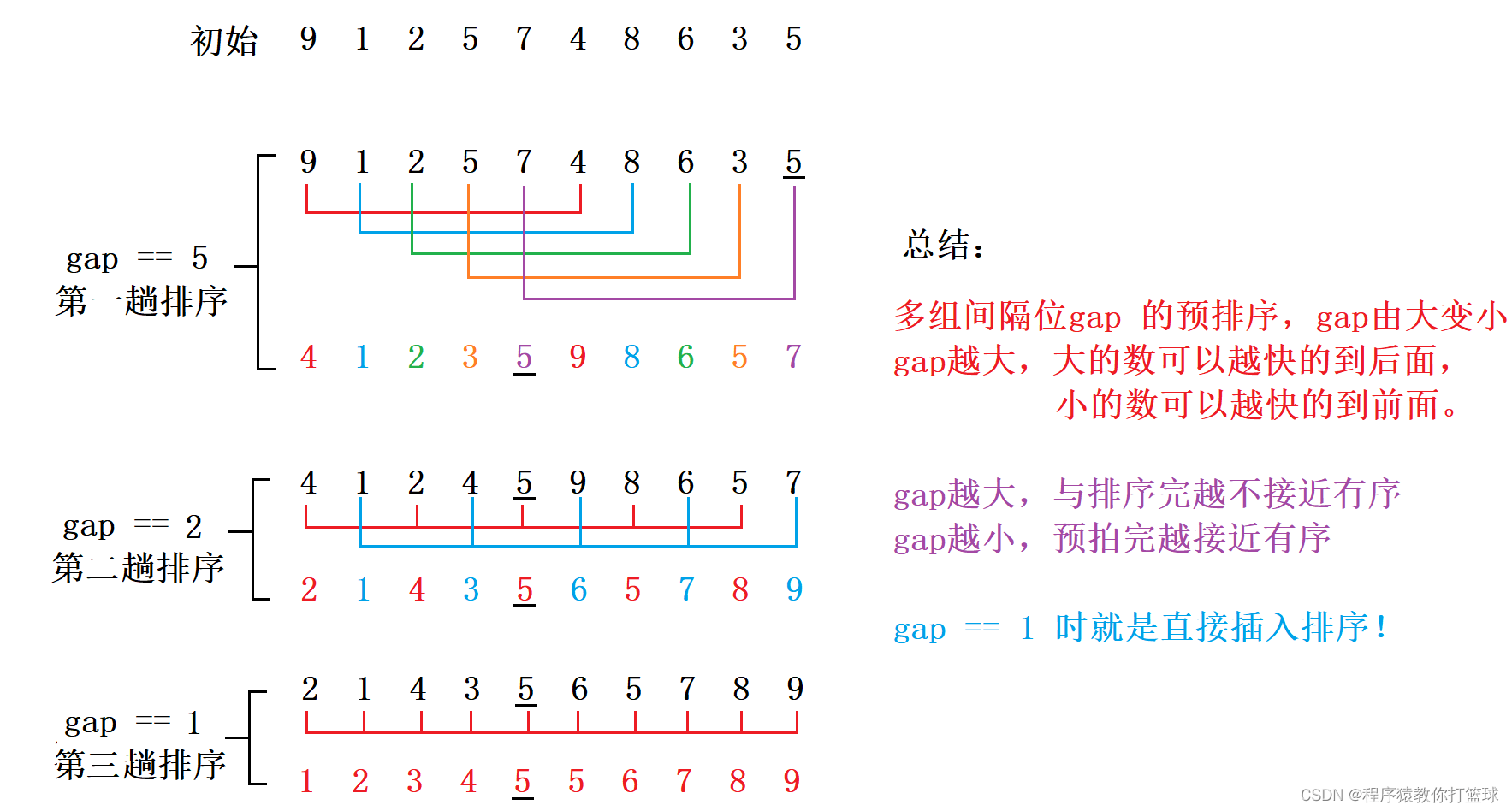 2. 当gap > 1时都是预排序,目的是让数组更接近于有序。当gap == 1时,数组已经接近有序的 了,这样就会很快。这样整体而言,可以达到优化的效果。