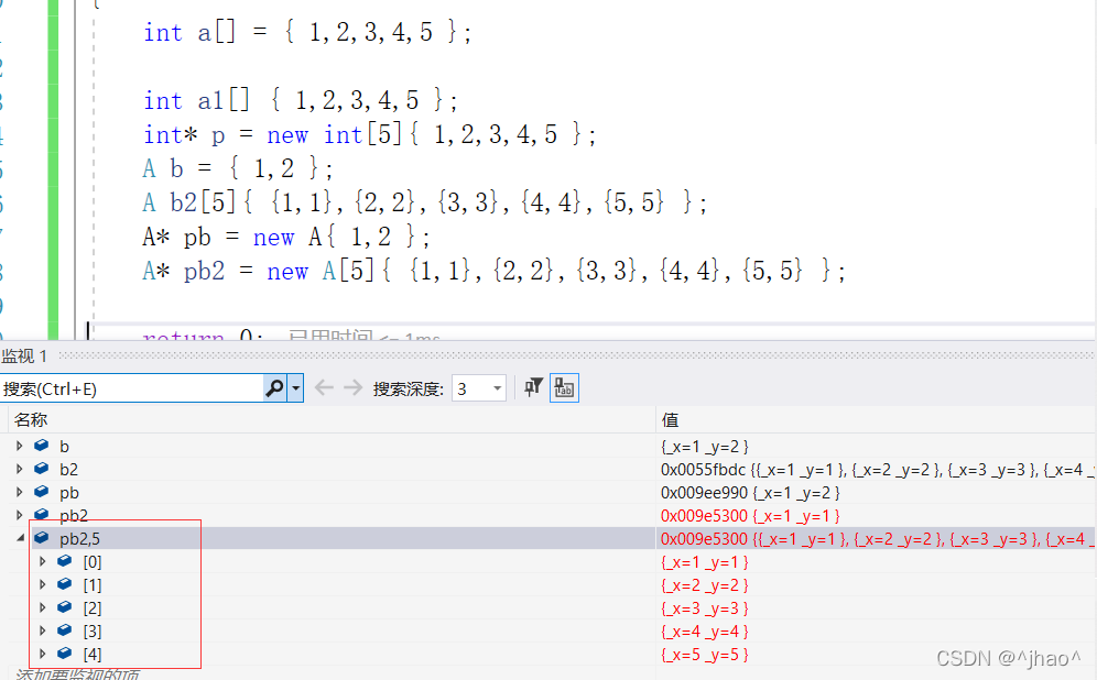 A* pb2 = new A[5]{ {1,1},{2,2},{3,3},{4,4},{5,5} };