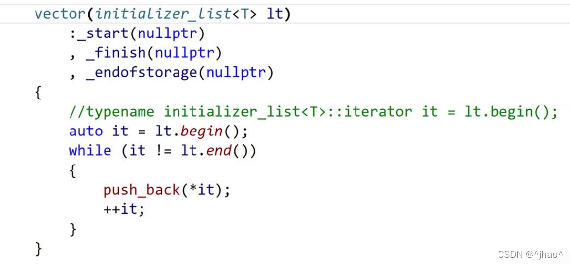实际上上面就是通过传参给initializer_list对象,这个对象相当于浅拷贝了外部的{1,2,3,4}的头指针和尾指针,这样vector的构造函数就可以通过迭代器遍历的方式一个个的push_back到自己的容器当中。上述过程initializer_list是很高效的,因为他只涉及浅拷贝指针和一个整形。