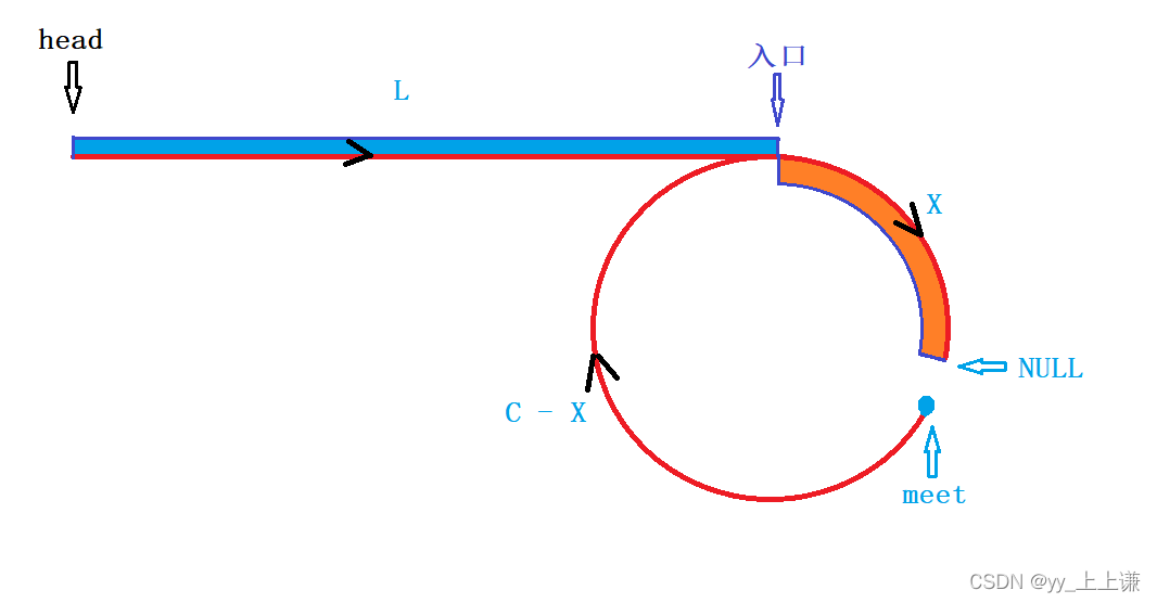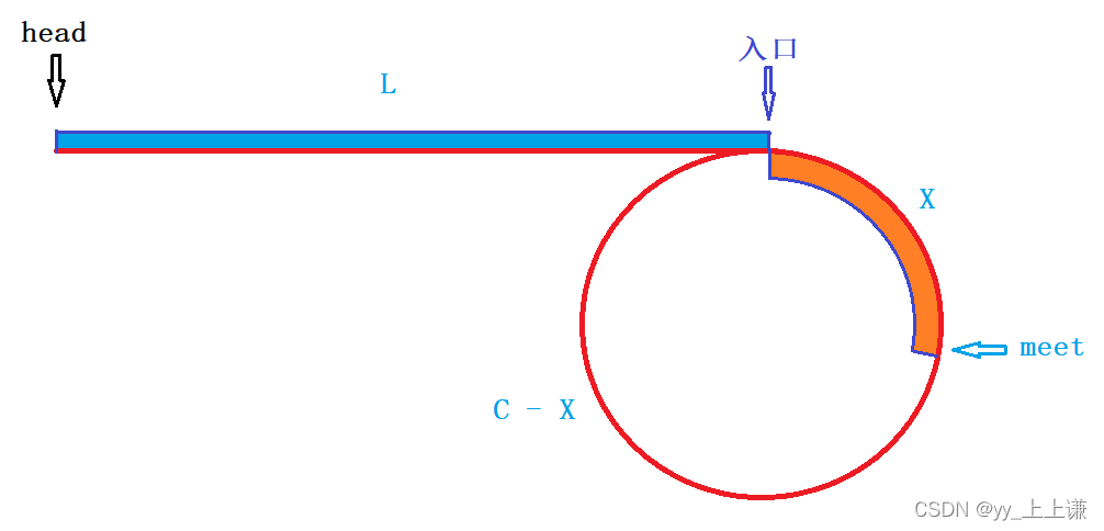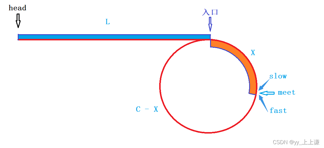 当快指针追到慢指针时,假设相遇点为meet,slow指针和fast指针在如图所示的:
