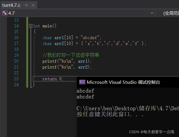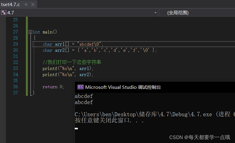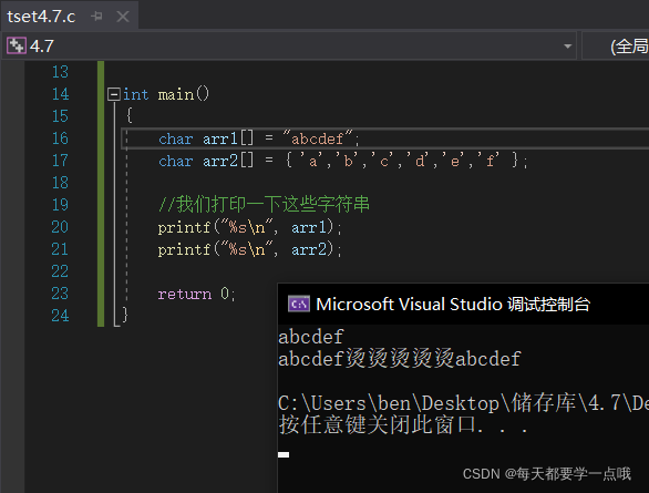 char arr1[]="abcdef\0"; //我们也试一下给它也加一个\0