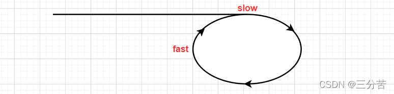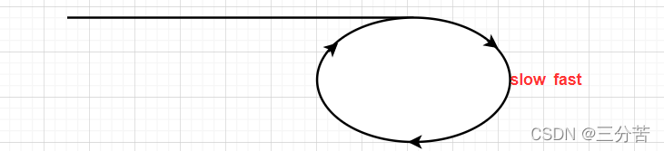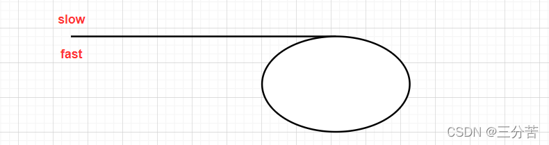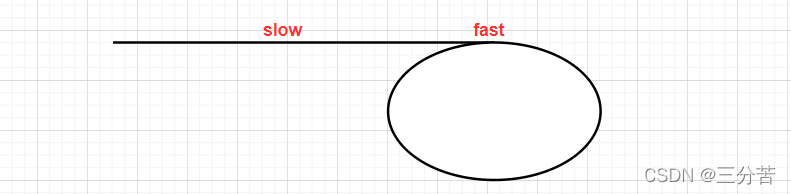 我们可以将上述图画的抽象一点,在没有进入环之前我们用直线表示,进入环之后用圈来表示,以此示意循环。此题需要用到我们之前讲解的求中间节点和求倒数第k个节点的快慢指针的思想。定义两个指针slow和fast均指向一开始的位置。 让slow一次走一步,fast一次走两步。