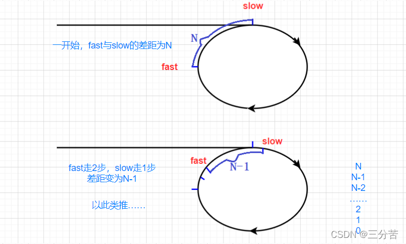 - 但是slow进环以后,在一圈之内,fast一定追到slow,它们的距离最多C-1