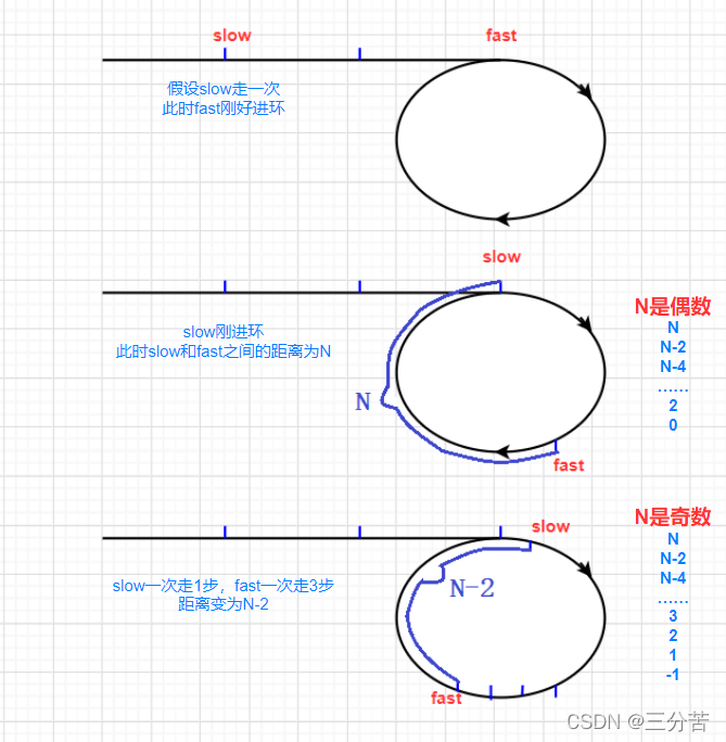 slow一次走1步,fast一次走3步,距离变为N-2。由此可见,fast和slow每走一次,距离缩短2。此时就不难发现了,需要分类讨论,当N是偶数时,刚好可以追上,当N是奇数时,追到最后距离为-1,此时就要再追了,意味着slow和fast之间的距离变成C-1。