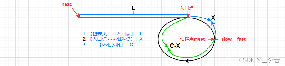 在具体讲解之前,首先要搞清楚,不存在说慢指针slow在里头走了一圈,快指针fast还没有追到slow,因为fast每次走2步,slow每次走1步,它俩间的距离每次都缩小1,所以只会越来越近,直到追到。最多最多也就快1圈,但从来也不会刚好满1圈。所以下面很容易推出slow和fast分别走了多少。