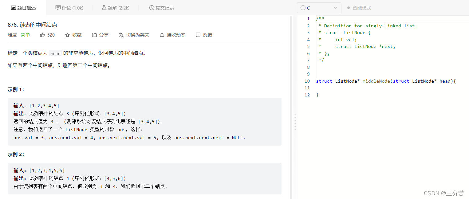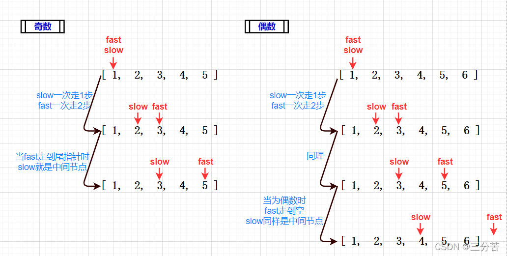 这道题要注意奇偶数,如果为奇数,如示例1,那么中间节点值就是3,反之偶数如示例2,返回第二个中间节点。此题我们定义两个指针slow和fast都指向第一个数据的位置,区别在于让slow一次走1步,fast一次走2步。当fast走到尾指针时,slow就是中间节点
