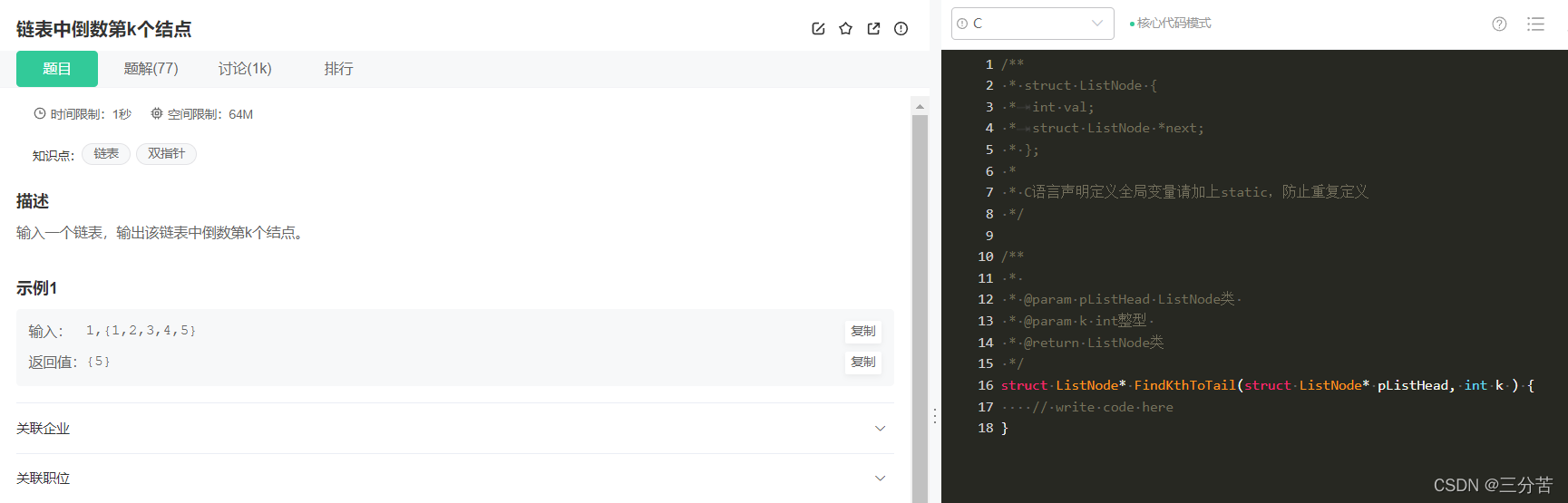 定义两个指针slow和fast,让fast先走k步,再让slow和fast同时走,当fast走到尾部时,slow就是倒数第k个,因为这样的话slow和fast的差距始终是k个,当fast走到空时结束。此题同样可以走k-1步,不过当fast走到尾部时结束,也就是fast的下一个节点指向空时结束,都一样。先拿走k步举例,如图所示: