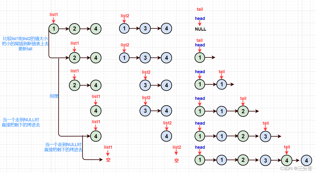 假设新链表的头叫head并指向NULL,还需要定义一个指针tail来方便后续的找尾,依次比较list1和list2节点的值,把小的放到新链表head上,并更新tail,再把list1或list2更新一下。当list1和list2两个链表中一个走到空时,直接把剩下的链表所有剩下的元素拷进去即可