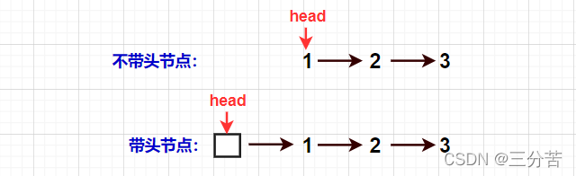 比如说同样一个链表存1,2,3。不带头节点只有这三个节点,head指向1。而带头节点的同样存3个值,不过有4个节点,head指向头部这个节点,这个节点不存储有效数据