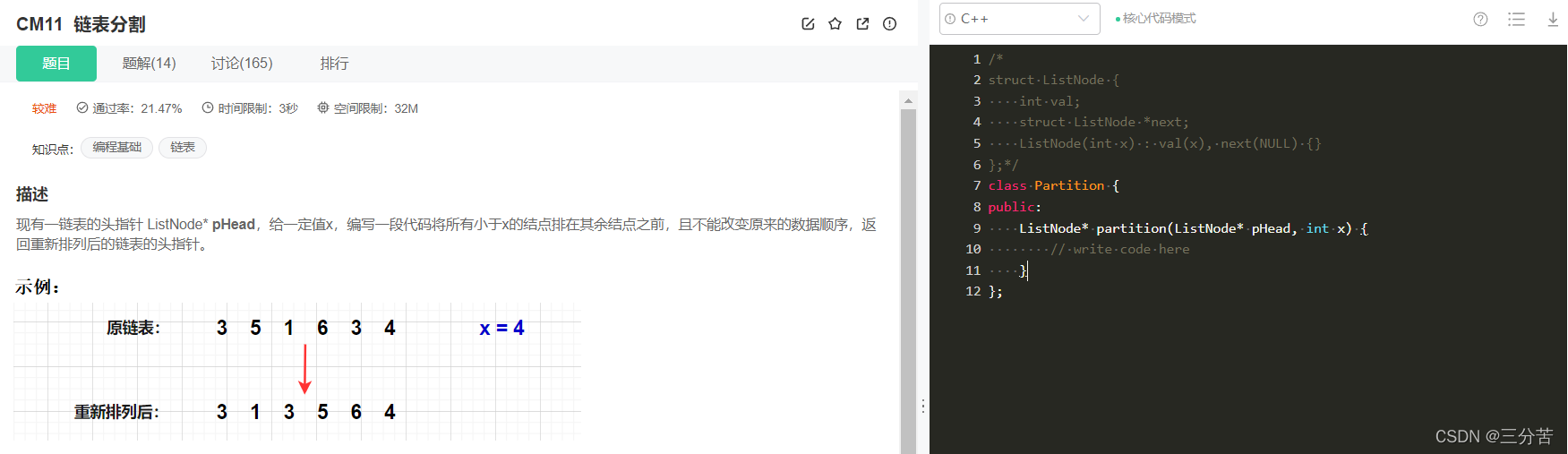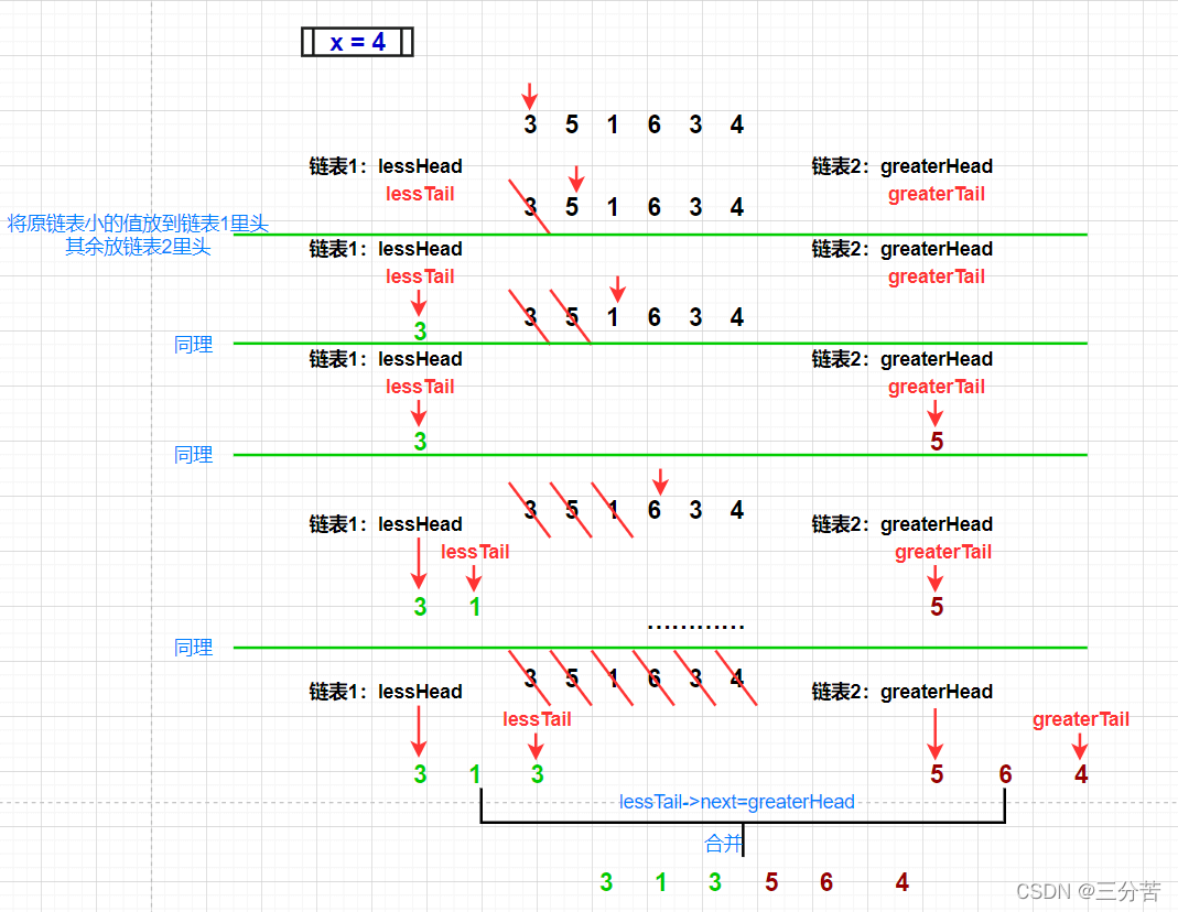 定义两个链表lesshead和greaterhead。遍历原链表,把 < x 的插入到链表1,把 > x 的插入到链表2,最后再把链表1和链表2链接起来。在定义两个尾指针以跟进链表1和2新增元素