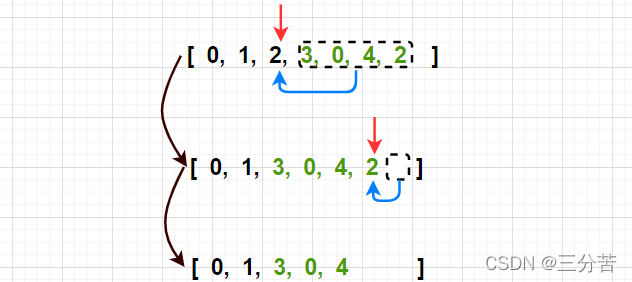 从第一个数据开始进行依次遍历,如同示例1,依次遍历数组,找到移除的元素2就把后面的数据往前挪动进行覆盖,如图所示: