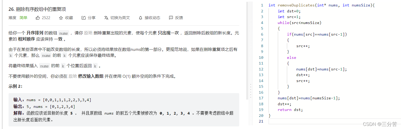 此题和上题类似,同样可以采用双指针,并在原数组进行改动,只需要定义两个变量dst和src作为数组nums的下标,但此时做出小变动,把src从下标1开始,而dst从下标0开始。让nums[src]每次和它前一个也就是nums[src-1]相比较,如果相等,则src++,若不等就把nums[src-1]赋给nums[dst],再dst++,src++。