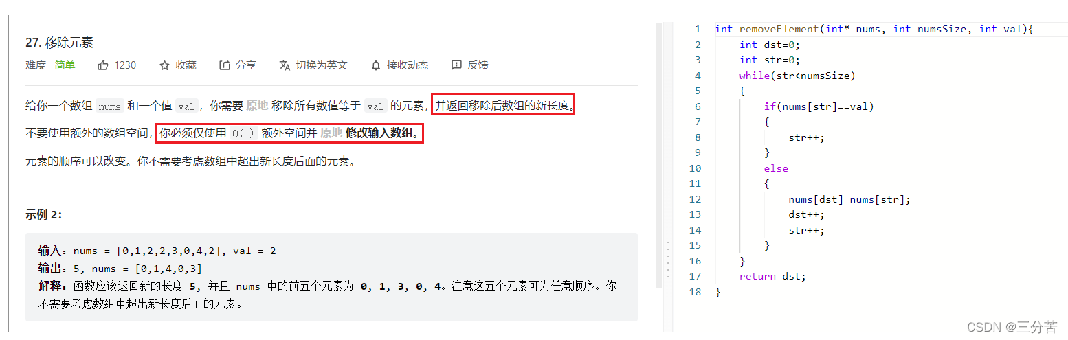 此法是在法二的基础上进行的升级,法二需要开辟额外数组,此法直接原数组改动。首先定义两个变量src和dst为0,都作为数组nums的下标,依次遍历src看nums[src]是否为val,若不是,将其赋给下标dst,再src++,dst++。若nums[src]=nums[dst],则只把src++,dst不动,最后再把长度dst返回即可。