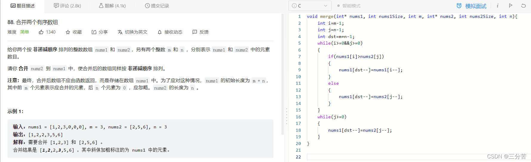 此法是在法二的基础上进行升级,直接在nums1原数组上进行改动,思想和法二差不多。不过有个需要改变的地方,法二是正着遍历数组,但是此法则需要倒着来遍历数组。那么此时的 i 变量就是nums1数组第m-1个下标,j变量就是nums2数组第n-1个下标,dst变量就是nums1数组最后一个元素下标(m+n-1)。实现原理同法二,不做过多赘述。注意:如果nums2数组的下标 j 先结束,那么nums1剩下的数组刚好排在前面,不需要动,如果是nums1数组的下标 i 先结束,则需要把nums2数组剩余的值赋到nums1数组上去。