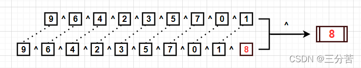 正如示例2,这里假设一共有10个数字,那么这里nums数组就是 [ 0 - 9 ],不过其中缺了一个数字,我们已经深知异或的运算规则(相同为0,相异为1)以及两个重要结论:1、两个相同的数字异或等于0。2、0与任何数字异或等于该任意数字。因此,我们完全可以先把原数组的所有元素异或起来,再把理论上0-n依次递增的所有元素都异或起来,然后两块再次异或得到的就是缺少的数字。