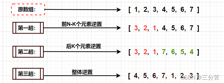 第一趟对它的前N-K个元素逆置,第二趟对它的后K个元素逆置,最后整体逆置。如图所示: