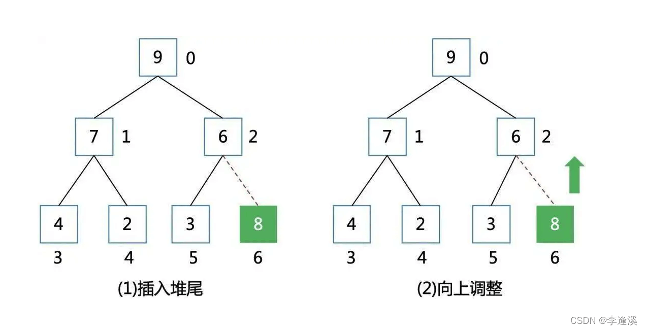 概念:有一个小/大堆,在数组最后插入一个元素,通过向上调整,使得该堆还是小/大堆。