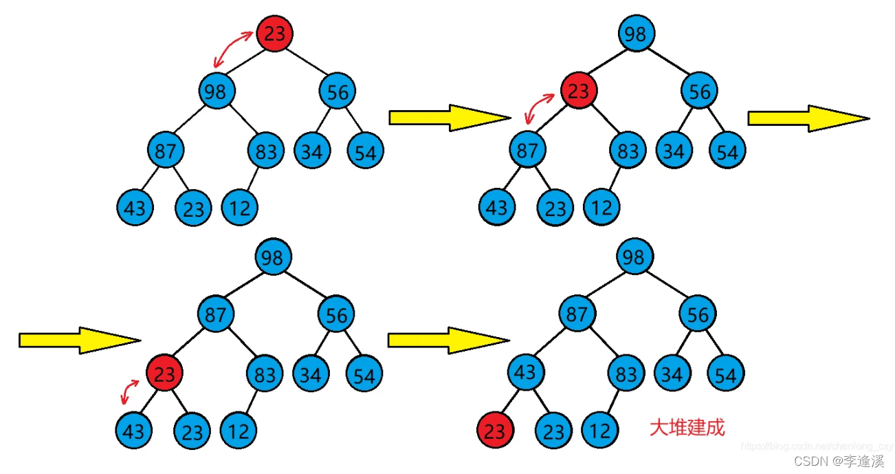 如图根为23,它的左右子树都是大堆,但整颗完全二叉树不是堆,通过向下调整可以使得整颗完全二叉树是堆。