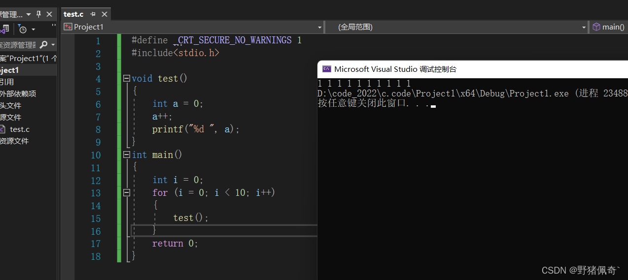 图一:test 函数里面定义的 a 是局部变量,局部变量在栈区上开辟空间,栈区的使用特点是进入变量的生命周期时自动为其开辟空间,离开变量的生命周期时自动销毁对应空间,所以这里每次调用 test 函数时 a 都会被重新定义并初始化为0,所以屏幕上打印的是10个1;