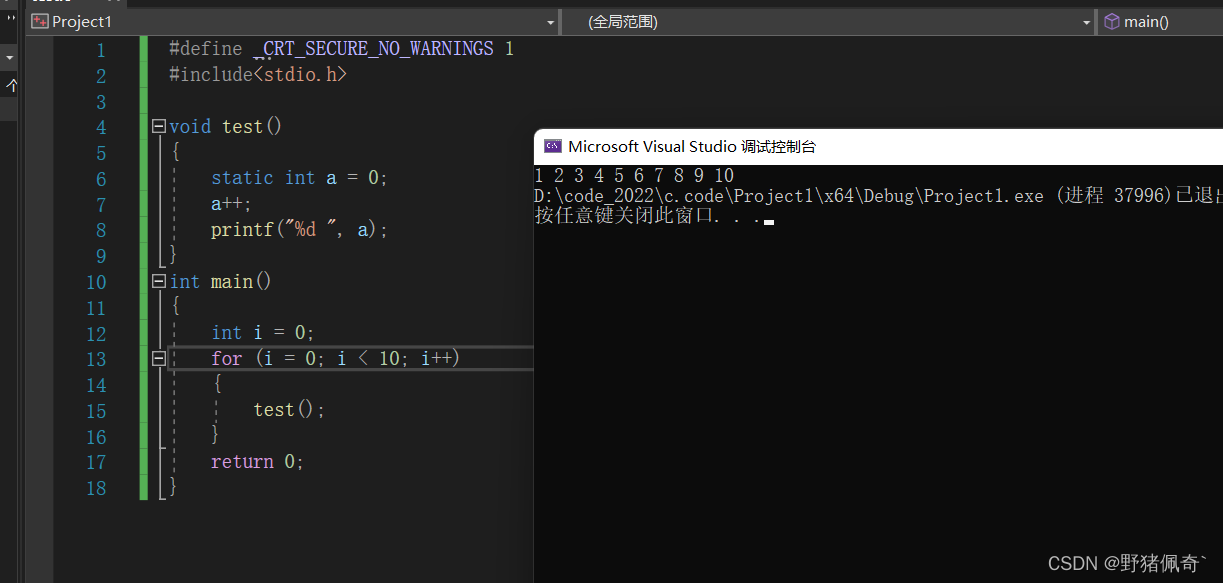 图二:我们把 a 用 static 修饰后发现屏幕打印的是1到10,就好像每次调用完 test 函数后 a 并没有被销毁,而是继续使用,下次调用 test 函数时 a 直接在之前的基础上进行 ++ 操作。