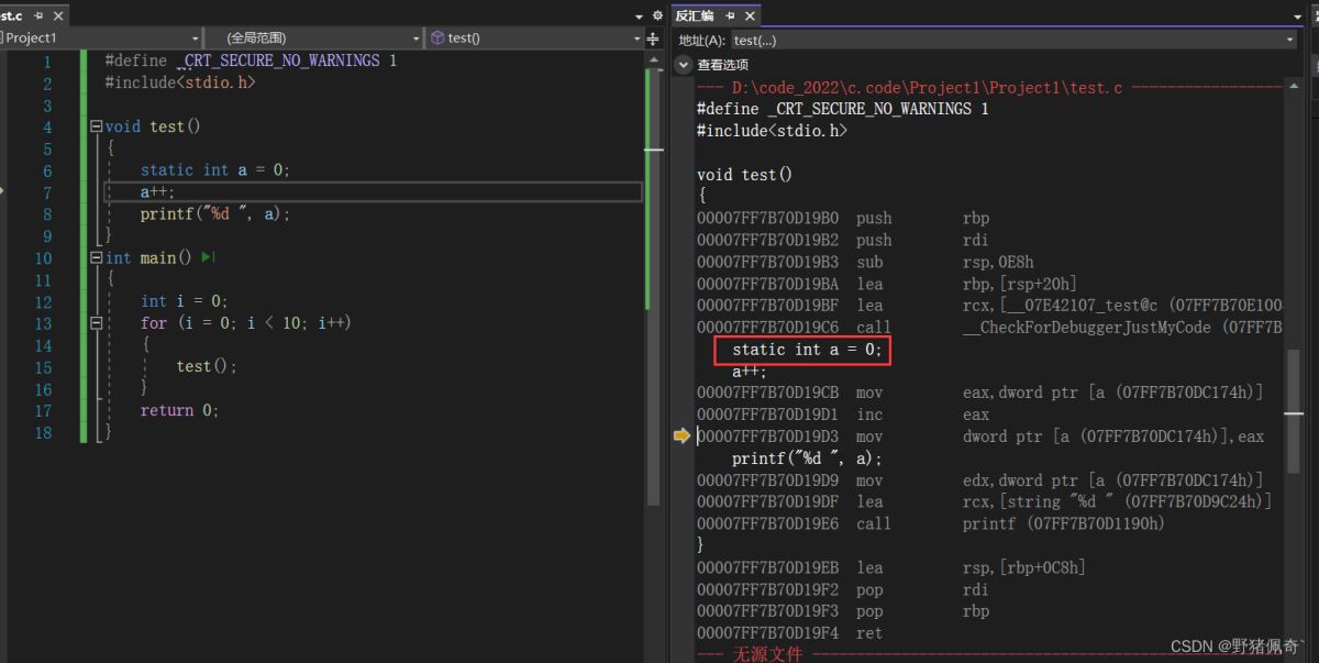本质上是:在编译环节的编译阶段编译器就会为被 static 修饰的局部变量分配空间,所以C程序在运行的过程中会直接跳过 static 修饰的语句,也就是说,在第二次及以上甚至第一次调用 test 函数时 static int a = 0; 这条语句都不会被执行。