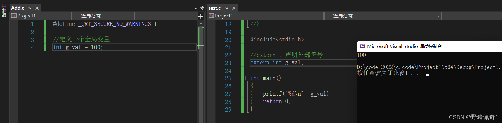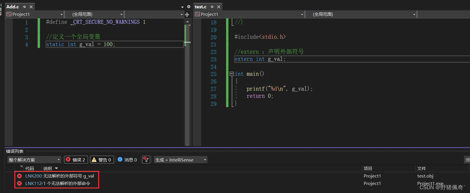 图一图二对比分析:我在Add.c中定义了一个全局变量g_val,因为全局变量具有外部链接属性,所以我只需要在test.c中对g_val进行声明之后就可以正常使用了,但是当我用 static 来修饰g_val时,我们发现,编译器说g_val是无法解析的外部符号;