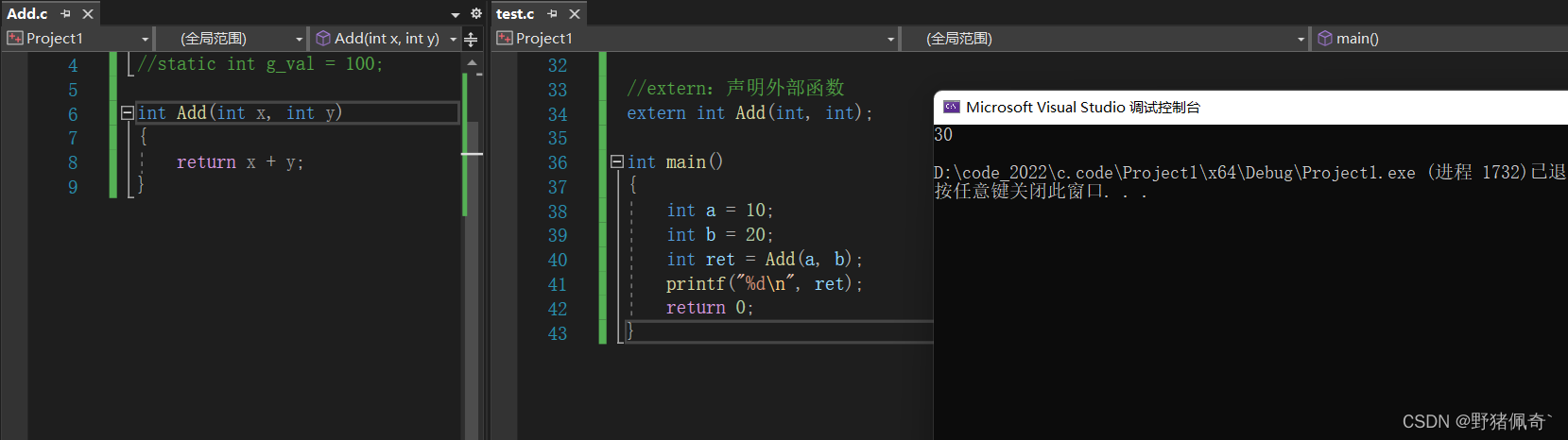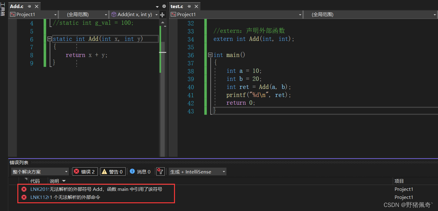 图一图二对比分析:这里和 static 修饰全局变量非常类似,我在Add.c中定义了一个Add函数,因为函数也具有外部链接属性,所以我只需要在test.c中对Add函数进行声明之后就可以正常使用了,但是当我用 static 来修饰Add函数时,我们发现,编译器说Add是无法解析的外部符号;