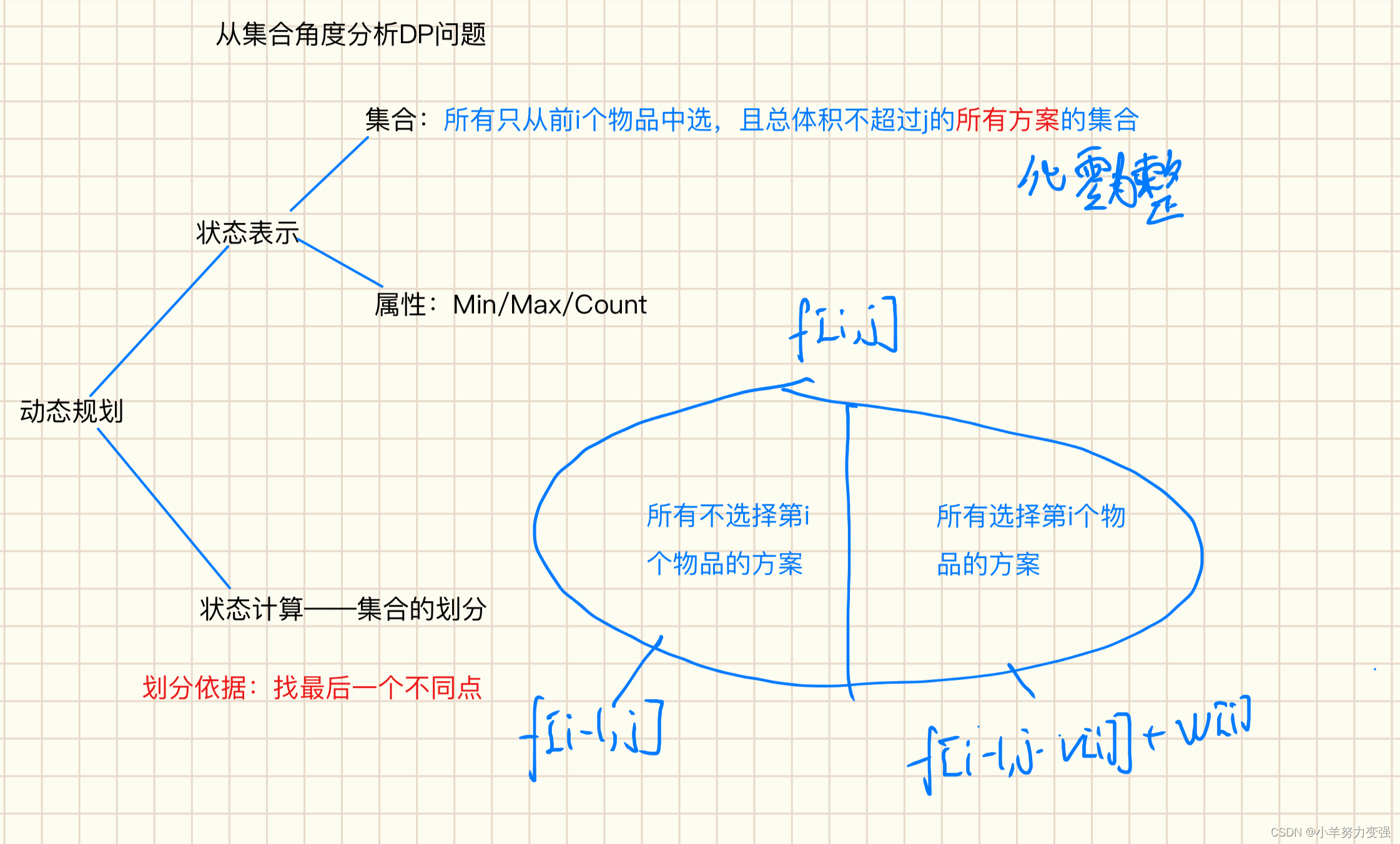 (1)状态f[i][j]定义:前 i个物品,背包容量 j 下的最优解(最大价值):