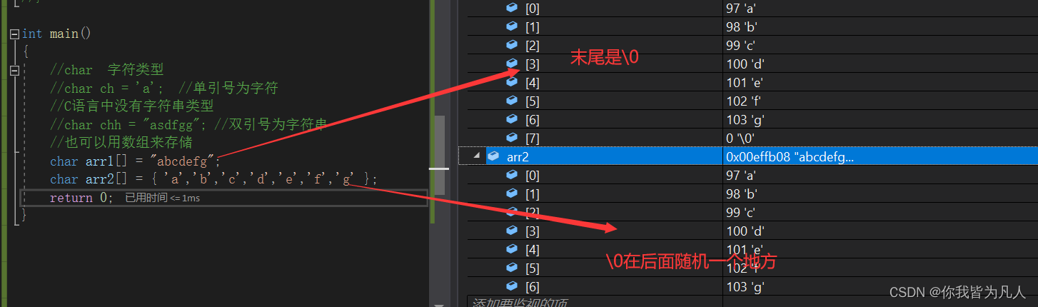 char arr1[] = "abcdefg";//最后隐藏着一个\0