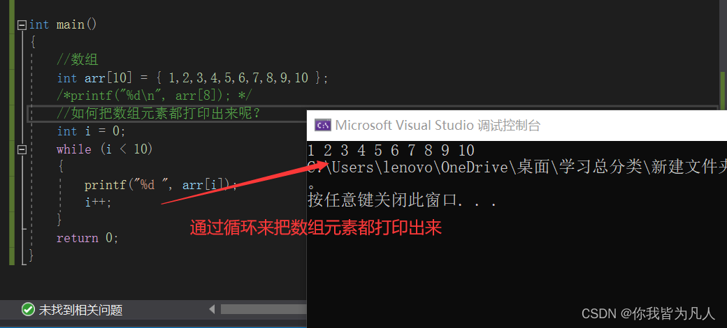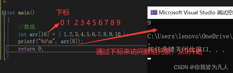 如果要存储1-10该如何存储呢 ? 如果还是一个个定义那么太麻烦了,C语言中给了数组的定义,一组相同类型元素的集合,在数组中,如果要去访问一个数字,那么需要知道下标,数组的每个元素都有一个下标,下标是从0开始的,接下来用以下代码来解释: