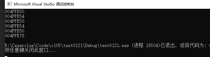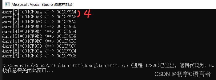 输出结果见下图,随着数组下标的增长,元素的地址,也在有规律的递增。整形数组每个元素占4个字节,共10个元素,总共40个字节。所以相邻元素的地址依次递增4个字节。