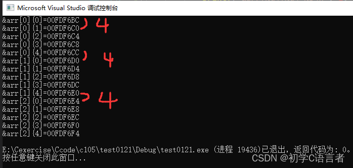 printf("&arr[%d]{%d]=%p\n", i, j, &arr[i][j]);//地址是连续的