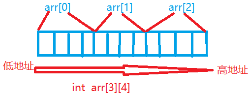二维数组的地址在内存中也是连续的,相邻元素依次相差4个字节,&arr[0][3]与&arr[1][0]是相连的。