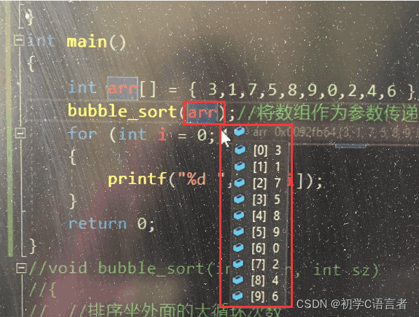 但是将数组当作参数传递给函数bubble_sort会发现,函数接受的数组只包含首元素3。