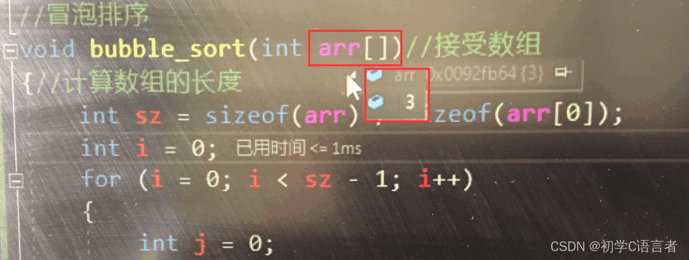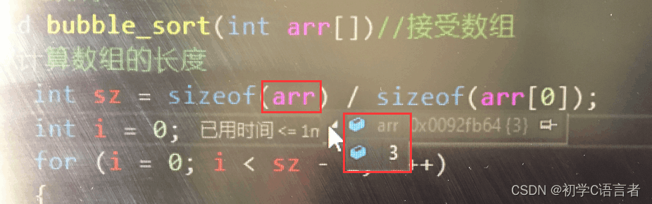 调试之后可以看到 bubble_sort 函数内部的 sz ,是1。
