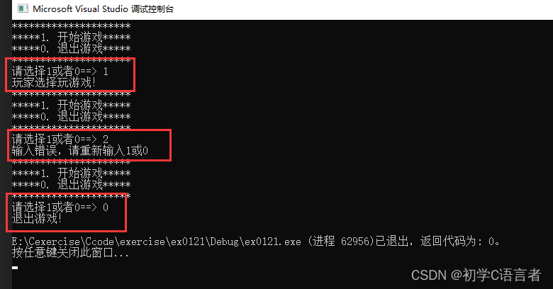 }//先进入循环输出提示信息,当输入1时,满足循环条件,接着执行循环里面的程序,也就是玩游戏